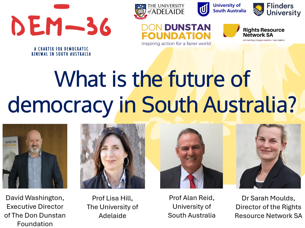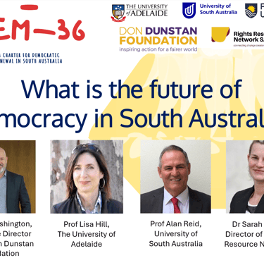 Dem36, with the support of partners, is hosting a public event to imagine the future of democracy in South Australia. The event will formally launch the draft Charter, and our panel of experts will introduce and discuss key themes.
